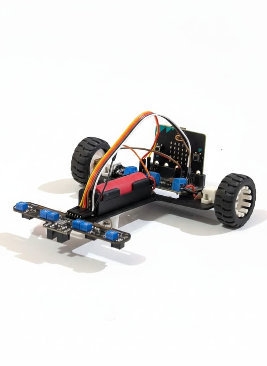 Ce robot est un véhicule suiveur de ligne intelligent, contrôlé par une carte Micro:bit V2, capable de suivre automatiquement une trajectoire noire tracée sur le sol grâce à un contrôle PID (Proportionnel–Intégral–Dérivé).